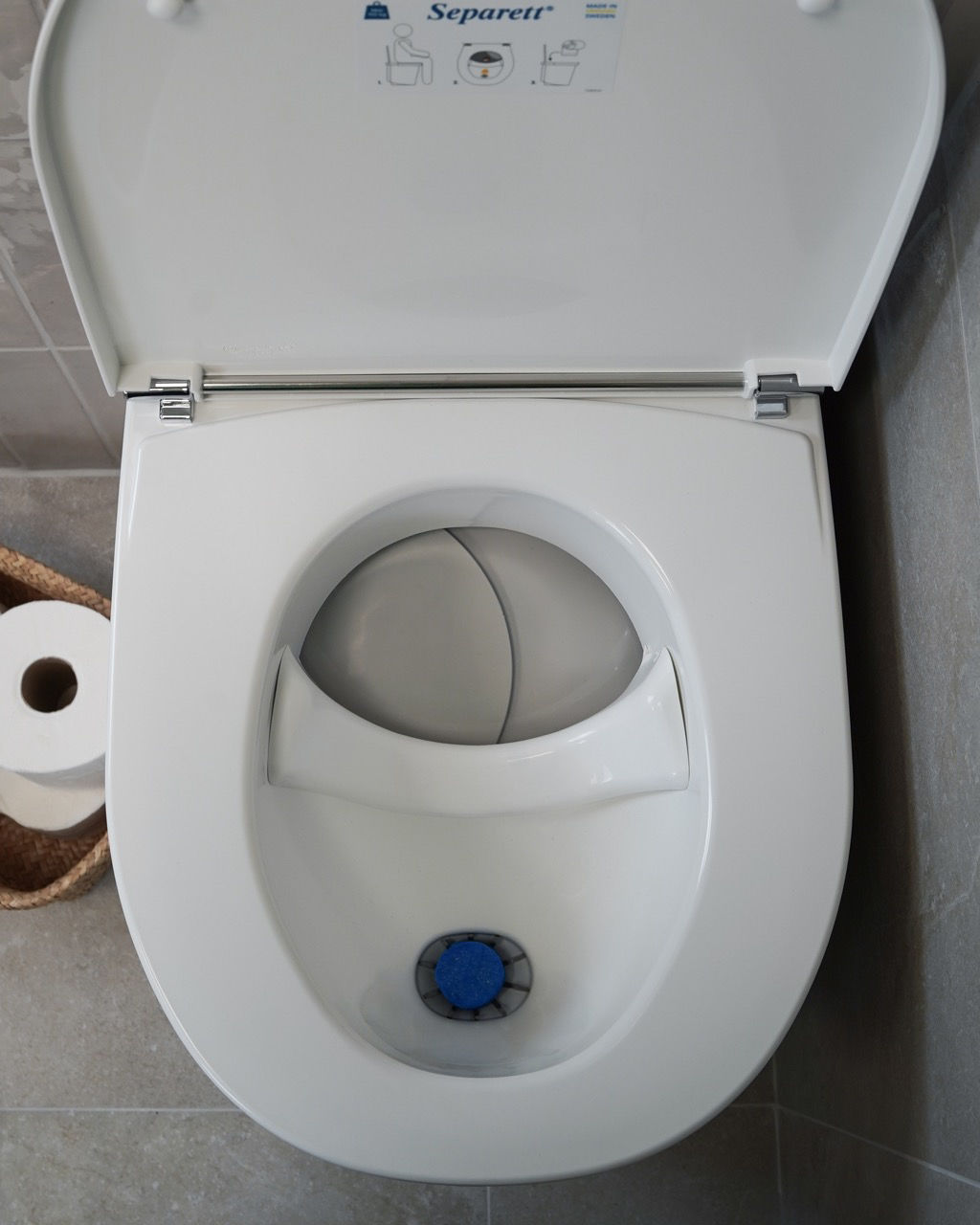 En urinseparerande toalett separerar urin och fast avfall och är utrustad med en fläkt som drar ut fukt och luft, vilket gör det helt luktfritt i utrymmet där toaletten står.